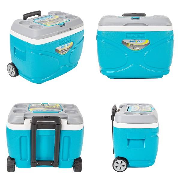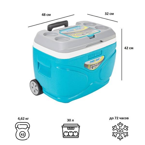 Сохраняет начальную температуру продуктов до 72 часов, модель снабжена колёсиками и удобной транспортировочной ручкой