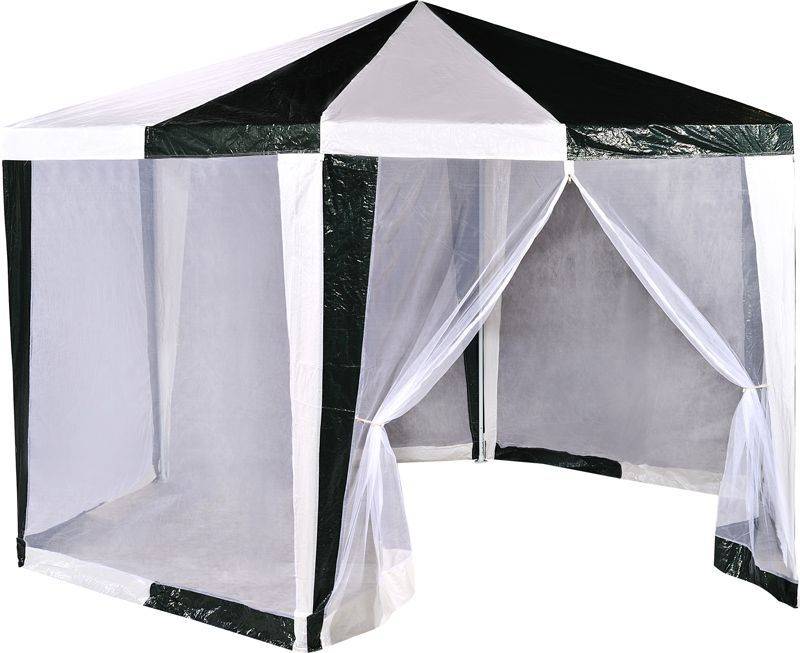 Тент шатер Green Glade 1001 имеет прочный каркас из металлической трубки 19x19x25 мм. Шатер выполнен в виде шестиугольника со стенками длиной 200 см.