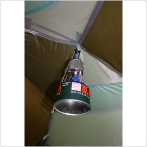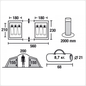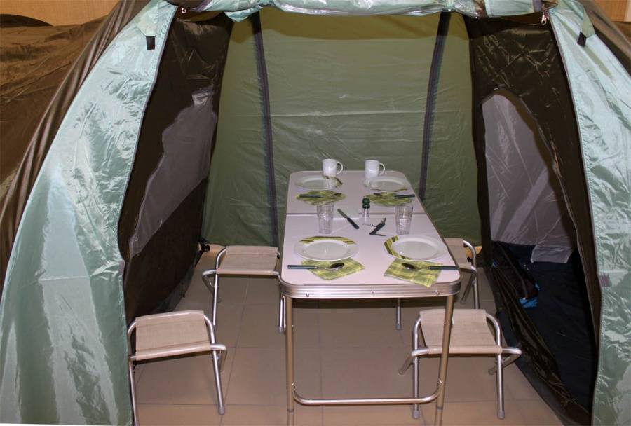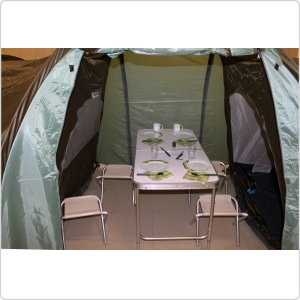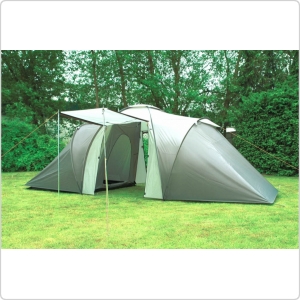 Одна из самых просторных палаток на шестерых человек. Имеет два входа и большой внутренний защищенный тамбур посередине. Оснащена москитными сетками на входе и окнах, откидным козырьком на стойках и вентиляцией.