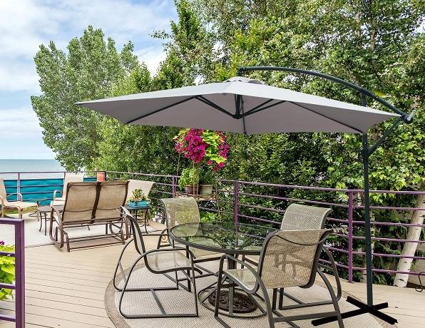 В комплекте с зонтом идет основание – крестовина, на которую для устойчивости зонта можно установить бетонные утяжелители (в комплект не входят) или привернуть ее через имеющиеся отверстия к полу.