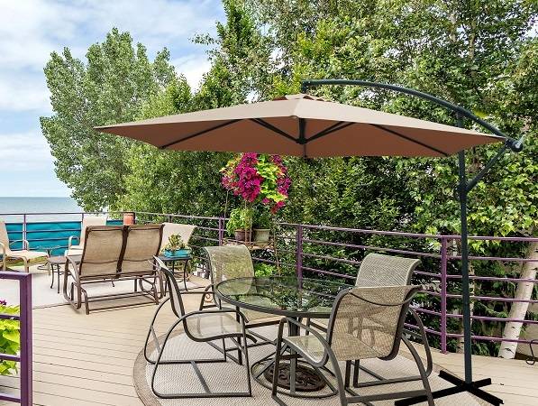 В комплекте с зонтом идет основание – крестовина, на которую для устойчивости зонта можно установить бетонные утяжелители (в комплект не входят) или привернуть ее через имеющиеся отверстия к полу.
