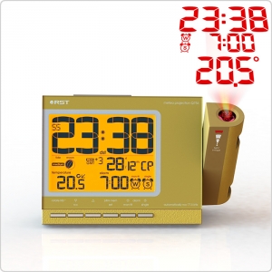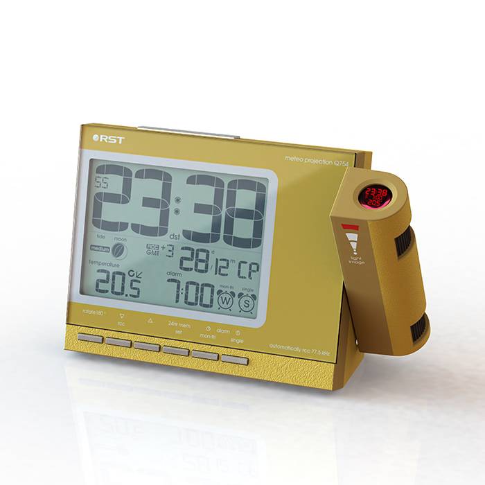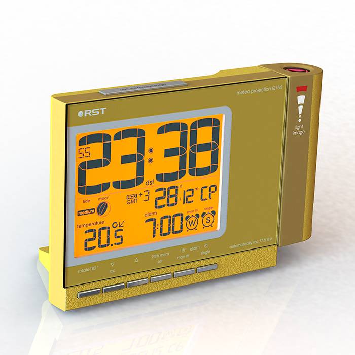 Проекционные метеочасы RST 32754 снабжены мягкой оранжевой подсветкой дисплея с возможностью плавной регулировки яркости. Часы с системой синхронизации времени и даты по радиосигналам точного времени RCC 77.5 kHz* и выбором режима индицирования 12/24 ч. Присутствует возможность установки времени в ручную и система отсчёт часовых поясов от GMT. Вечный календарь с указанием с указанием даты и дня недели.