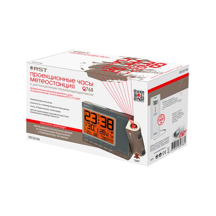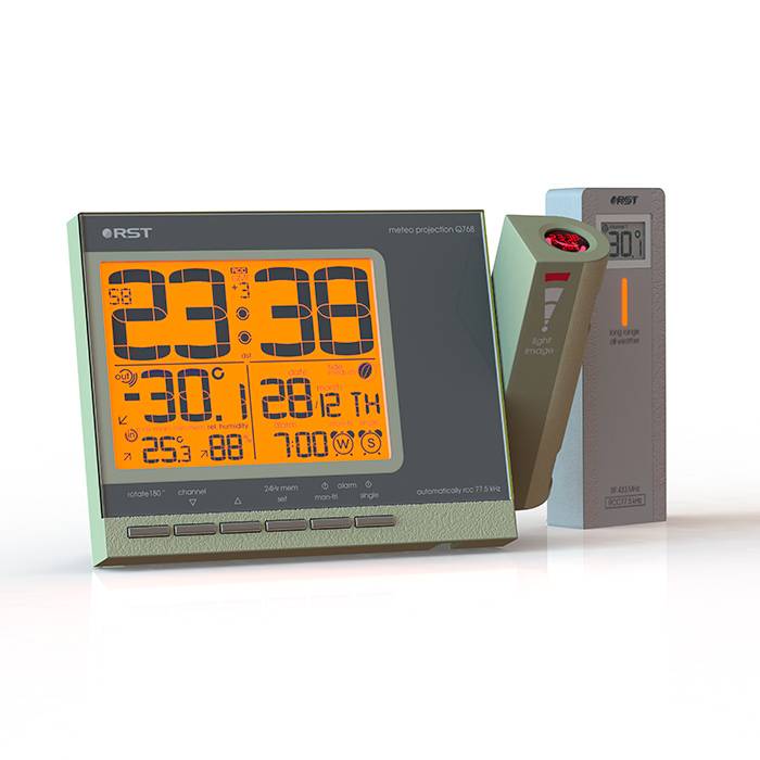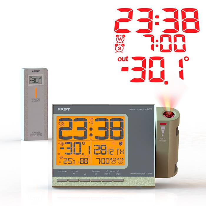 Проекционные метеочасы RST 32768 отображают проекцию времени и температуры на потолок или стену. Благодаря беспроводному радио датчику они измеряют температуру как внутри помещения, так и там, где установлен радиодатчик, например на улице. Радиус приёма сигнала от радиодатчика до 30 метров (при отсутствии помех). Часы отображают время и дату, к тому же, они оснащены умным будильником.