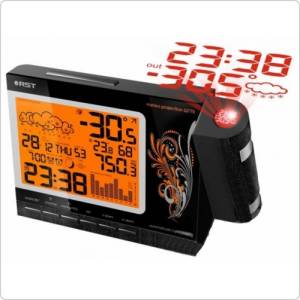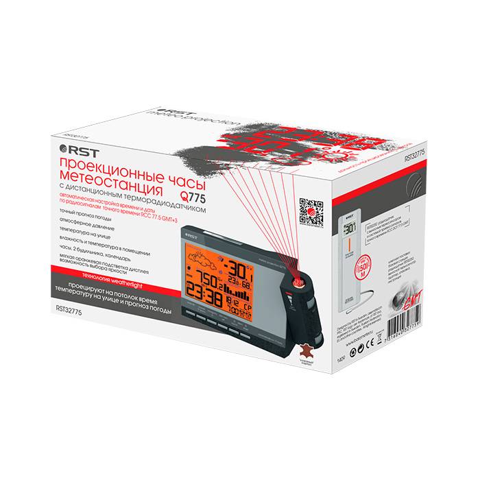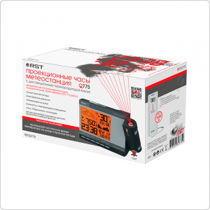 Проекционные часы-метеостанция RST 32775 осуществляют проекцию времени, температуры на улице и прогноза погоды на стену или потолок в тёмное время суток. Их отличает лёгкая настройка фокуса и положения проецируемого изображения, а также возможность поворота изображения на 180 градусов. Проектор метеостанции - повышенной чёткости, дальность проецирования до 10 метров.
