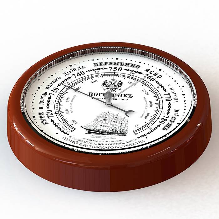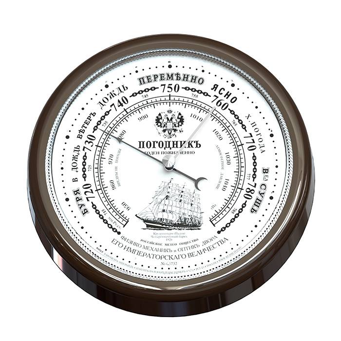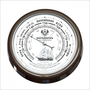 Классический механический барометр - анероид. Выполнен в старинном стиле, характерном для конца XIX начала XX веков. Корпус барометра изготовлен из полированного акрила. Диапазон измеряемых величин от 710 до 790 мм Рт ст.