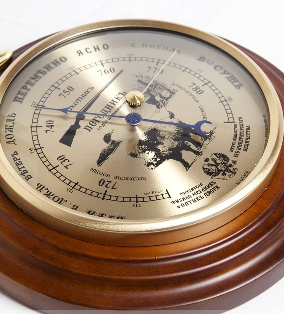 Бapoмeтp ПогодникЪ Охотник RST 05358 отслеживает даже небольшое атмосферного давления. Он позволяет с легкостью контролировать величину атмосферного давления и скорость его измерения для предсказания погоды. Для этого на его циферблате присутствуют две стрелки. Одна самf передвигается за счет изменения давления, а другая находится в неподвижном состоянии и ею можно управлять самостоятельно. Если ее совместить с основной стрелкой, то через некоторое время можно понять, давление будет падать или расти. Быстрый спад давления означает бурю. А постоянное увеличение тёплую солнечную погоду.