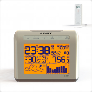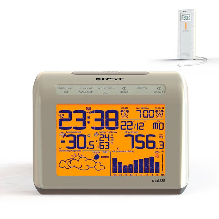 Метеостанция с часами и будильником. Оснащена беспроводным термодатчиком, с помощью которого вы можете контролировать температуру воздуха, например, на улице. Функциональность Snail 8 отличная. Кроме контроля температур, она автоматически ведет анимированный прогноз погоды на следующие сутки. В ней есть цифровой барометр с указанием значения атмосферного давления с разрешением 0,1 ммРтст, график изменения атмосферного давления и индикатор тенденций изменения. Анимированный лунный календарь с указанием силы приливов и отливов, температура воздуха на улице, полученная от радиодатчика, температура и относительная влажность воздуха внутри помещения, тенденция их изменения. Температура индицируется в градусах Цельсия. Есть автоматическое запоминание максимального и минимального зарегистрированных значений температур и влажности воздуха, индикатор состояния батареек базовой станции и радиодатчика.