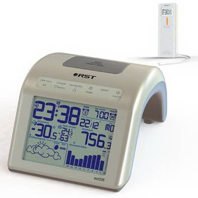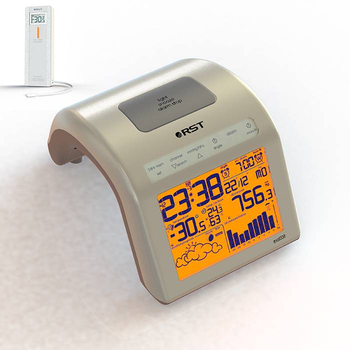 Метеостанция электронная Snail 8 RST88338 имеет обтекаемую изогнутую форму, напоминающую улитку, по этой причине, серию моделей назвали "Snail". Удобные сенсорные кнопки управления, достаточно прикоснуться для включения или выключения любой функции, простая интуитивно понятная настройка. Приятная мягкая оранжевая подсветка дисплея, часы с системой синхронизации времени и даты по радиосигналам точного времени RCC DCF77.5 kHz*, отсчёт часовых поясов от GMT, возможность установки времени в ручную, система DST - автоматический переход на зимнее/летнее время (для использования в странах, в которых действует зимнее/летнее время), вечный календарь с указанием с указанием даты, и дня недели. Установка по умолчанию (заводские настройки) приёма сигналов точного времени рассчитана на Московское время: GMT+3, DST-OFF. Системы “Intelligent alarm” (разумные будильники), один разбудит исключительно по рабочим дням, иной в любое время один раз, “gentle alarm” постепенное увеличение громкости сигнала будильника,“snooze” повтор сигнала будильника через 8 минут.