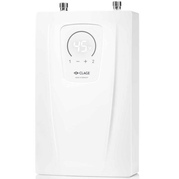 Проточный водонагреватель CLAGE CEX 9-U имеет стандартную для подобных устройств прямоугольную форму. Рабочий блок закрыт пластиковым корпусом белого цвета. В верхнюю часть встроен блок управления с индикатором температуры и кнопками управления, о функциональности которых написано выше. Подводка прибора находится сверху, что говорит о том, что прибор рассчитан для расположения под мойкой, умывальником или в монтажном шкафу. Подключение к водопроводу и выходной трубе осуществляется через разъемы 1/2 дюйма.