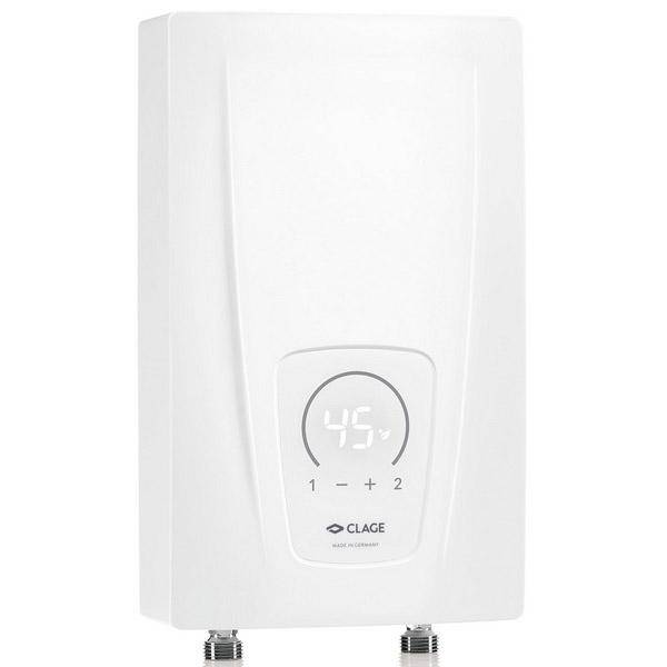 Проточный водонагреватель CLAGE CEX 11/13 имеет стандартную для подобных устройств прямоугольную форму. Рабочий блок закрыт пластиковым корпусом белого цвета. В нижнюю часть встроен блок управления с индикатором температуры и кнопками управления, о функциональности которых написано выше. Подводка прибора находится снизу, что говорит о том, что прибор рассчитан для расположения над мойкой, монтажном шкафу и любом другом удобном месте. Подключение к водопроводу и выходной трубе осуществляется через разъемы 1/2 дюйма.