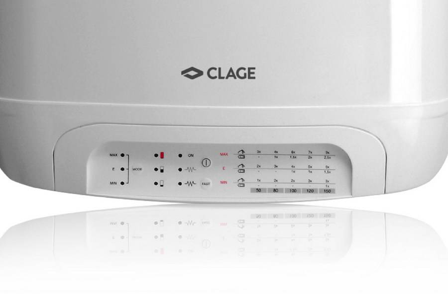 CLAGE SX 100 может с высокой точностью поддерживать температуру воды в одном из трех режимов, которые переключаются с помощью кнопок на блоке управления, размещенном на лицевой панели устройства. Пользователь может установить +40°C, +60°C или +85°C. Кроме того, потребителю доступен режим быстрого нагрева, когда оборудование нагревает полный бак до максимально допустимого значения, работая в данном случае в режиме бойлера. Такой вариант, как правило, используется в тех случаях, когда дом подключен к двухтарифному режиму потребления электричества, нагревая максимальный объем в ночной период по сниженной стоимости киловатт-часов.