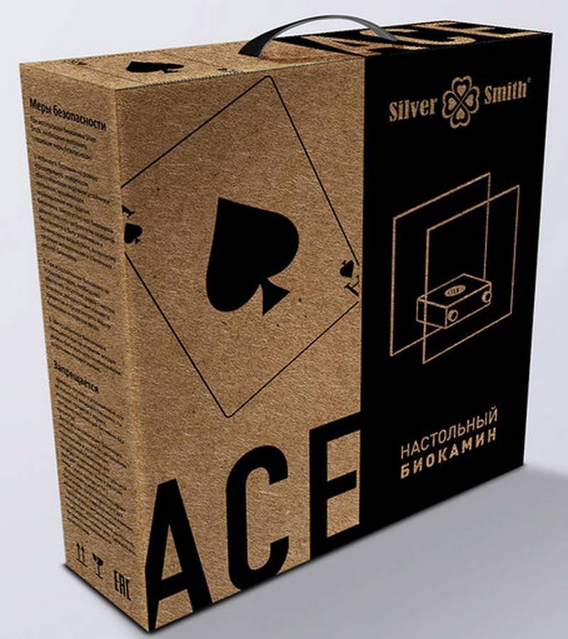 Новый биокамин настольный Silver Smith ACE в оригинальной упаковке с символикой игральных карт и удобной пластиковой ручкой.