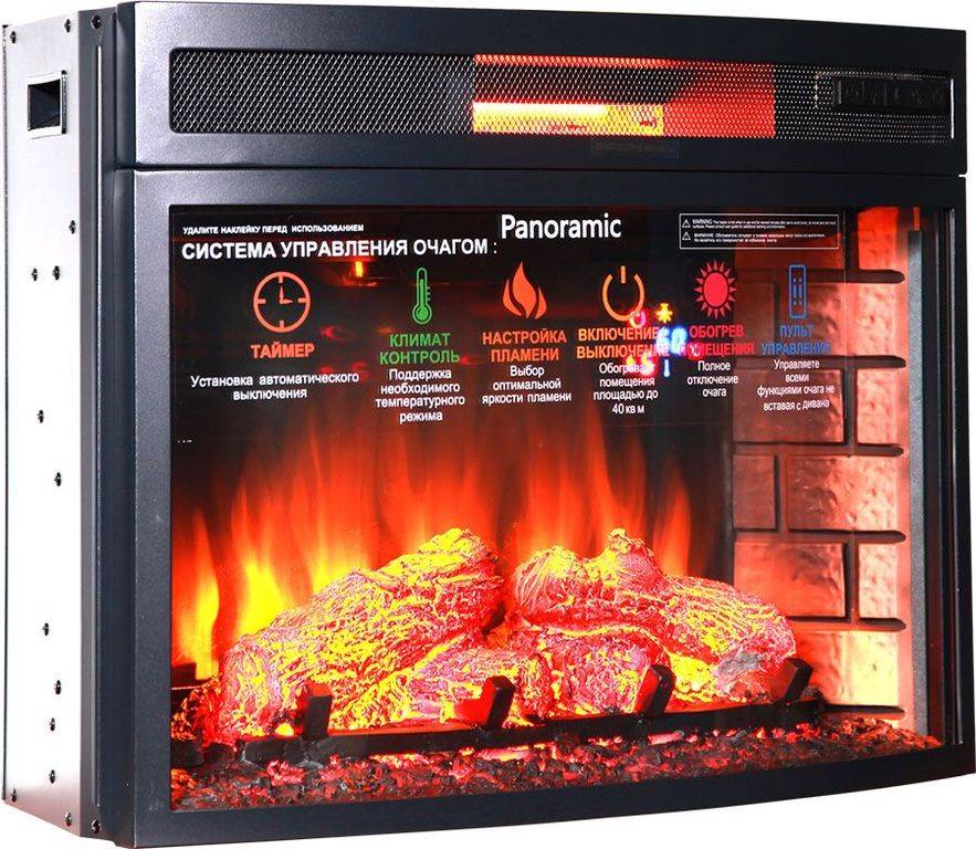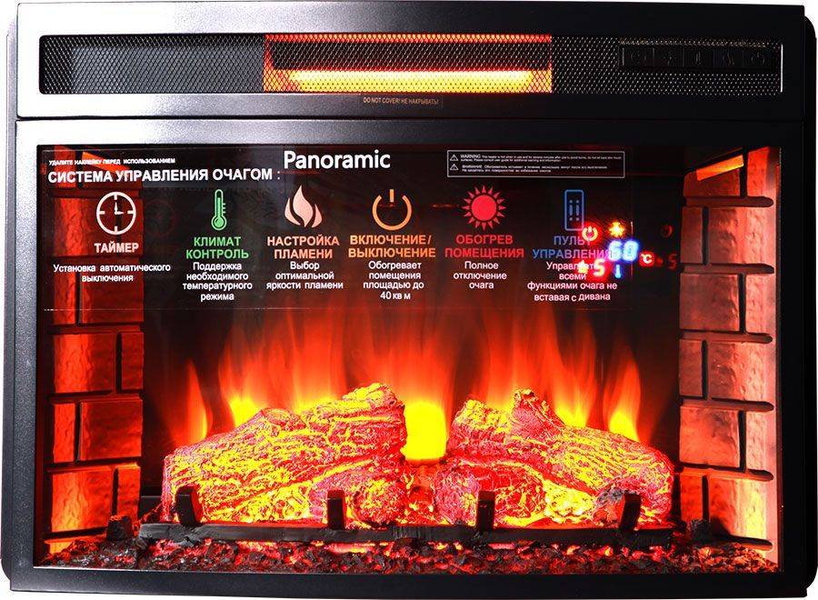 Благодаря использованию современного LED освещения, панорамному стеклу и особой декорации дров, выполненных по слепку с настоящих сгоревших головешек, модель создает красивейший эффект горения пламени. Панорамное стекло значительно увеличивает глубину обзора внутреннего пространства топки и создает особый 3D эффект. Доступна регулировка яркости пламени и дров (5 режимов), а также «АВТО-Режим» при котором происходит разгорание и затухание в автоматическом режиме.