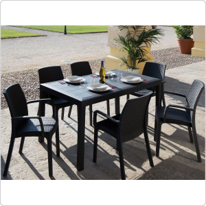 Спинка стула имеет плетение под искусственный ротанг. Материал стула прочный пластик, он не подвержен гниению, не выгорает на солнце и не бледнеет со временем.