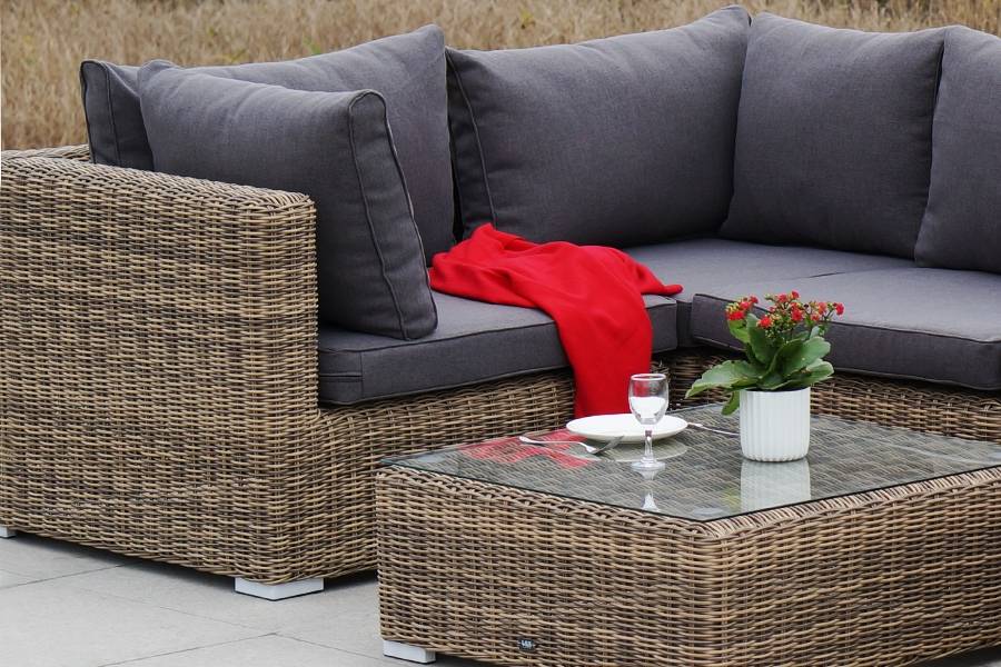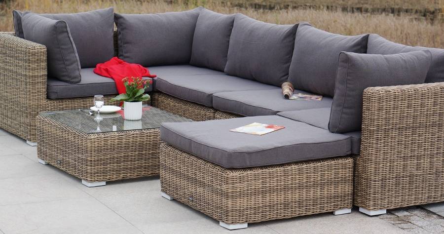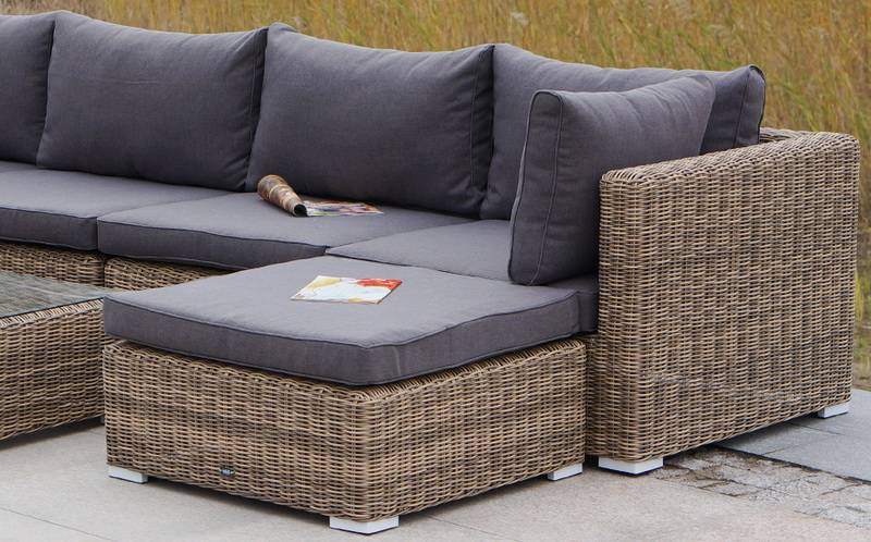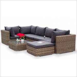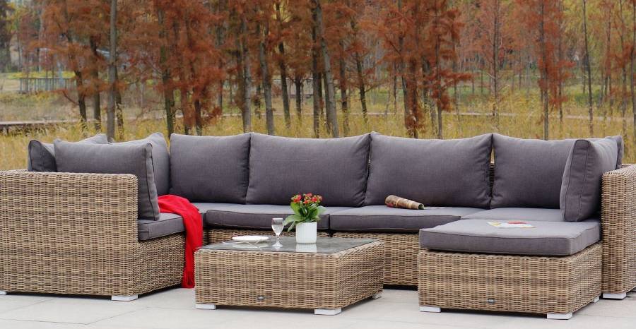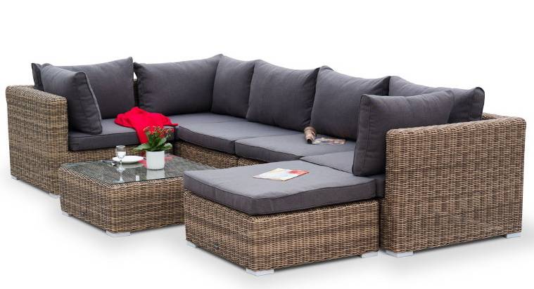 Мебель с современным и универсальным дизайном оформлена в естественных природных тонах, которые прекрасно интегрируются в дачный интерьер. Подушки серого цвета привносят выразительные нотки и интересное «звучание» мебели. Комплект выглядит гармонично и самодостаточно.