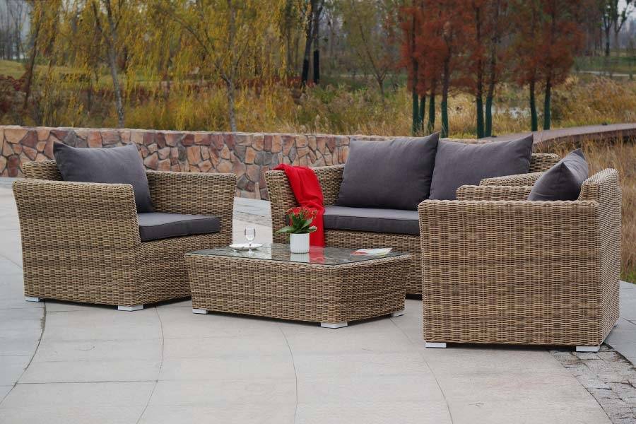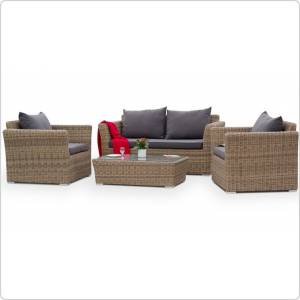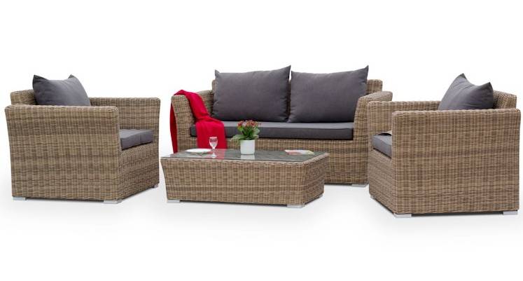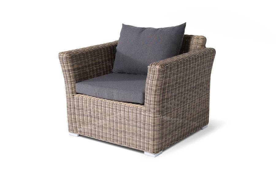 Лаунж зона 4 SIS Капучино Сингл в лаконичном стиле, сочетающим в себе нотки классики и модерна. Силуэт мебели изящный, подчеркнутый красивым богатым рисунком искусственного ротанга. Природный цвет ротанга подчеркнут удобными мягкими подушками серого цвета.