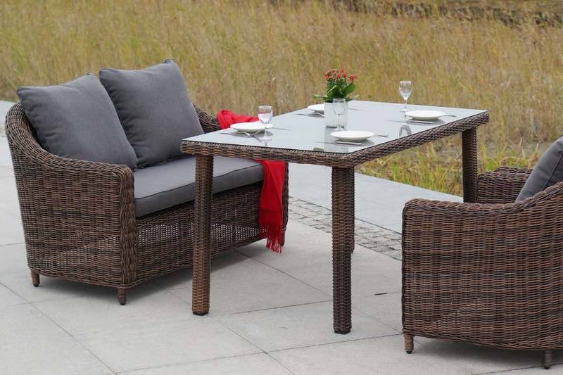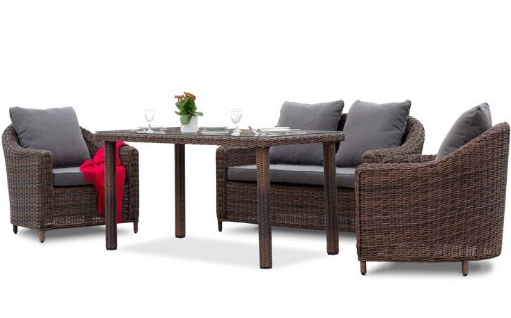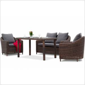 Роскошная и стильная обеденная группа 4 SIS Кон Панна из искусственного ротанга на 4 персоны. Оригинальный дизайн, плавность линий, закругленные углы, высокие и удобные подлокотники придают изысканности комплекту и подчеркивают его солидность и респектабельность. Диван и кресла комплектуются подушками со съемными чехлами серого цвета для максимального комфорта. Прочный каркас и ножки изделий выполнены из алюминия, что гарантирует продолжительный срок службы модели. Обеденный стол со стеклянной столешницей толщиной 5 мм.