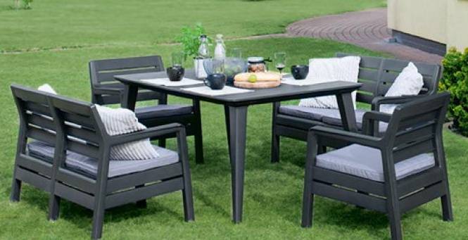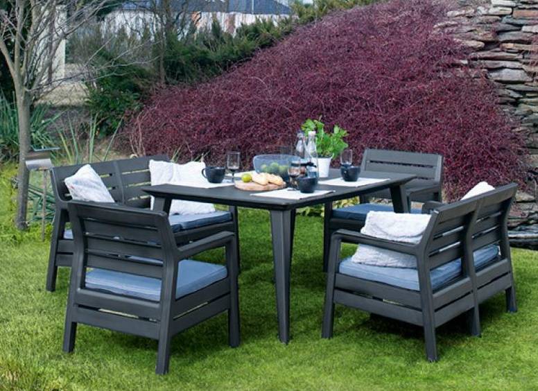Комплект мебели обеденный Keter Delano set with Lima table 160 - комплект мебели с фактурой, напоминающей деревянные панели. В состав гарнитура входят два дивана, два кресла с подлокотниками и большой прямоугольный стол, определяющий комплет как классический "dining set". Идеально подходит для размещения на балконе, террасе или в саду. Легко собирается и не требует допольнительного ухода. Мебель устойчива к неблагоприятным погодным условиям и ультрафиолетовым лучам. Комплект доступен в теплой, классической цветовой гамме.