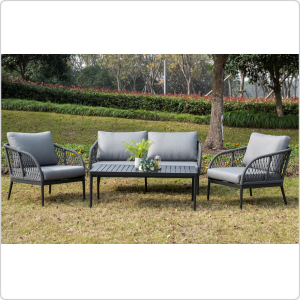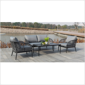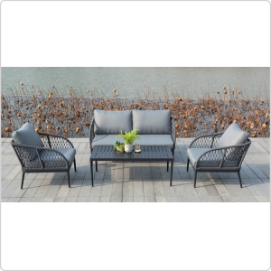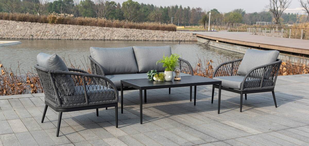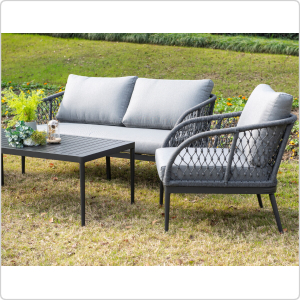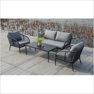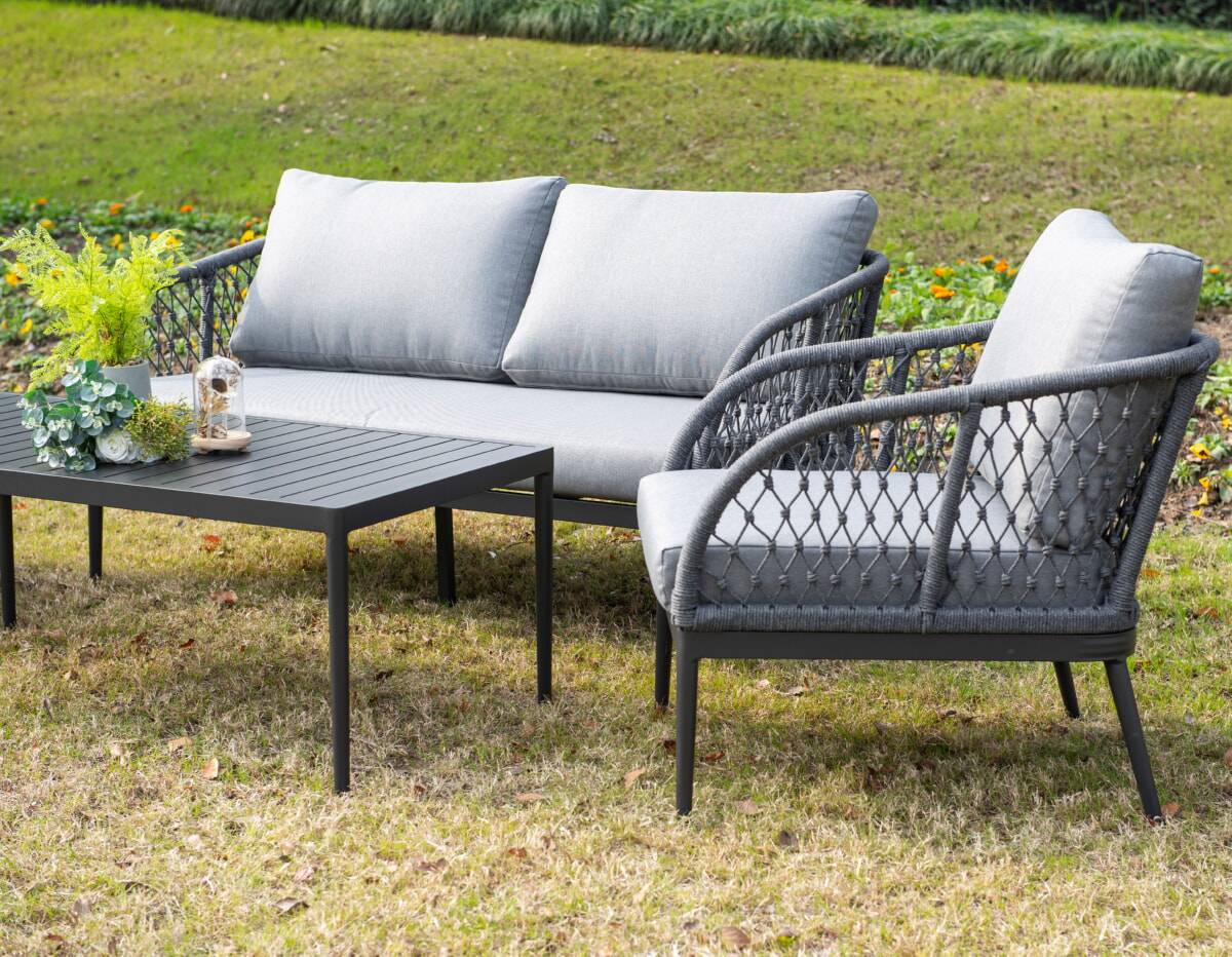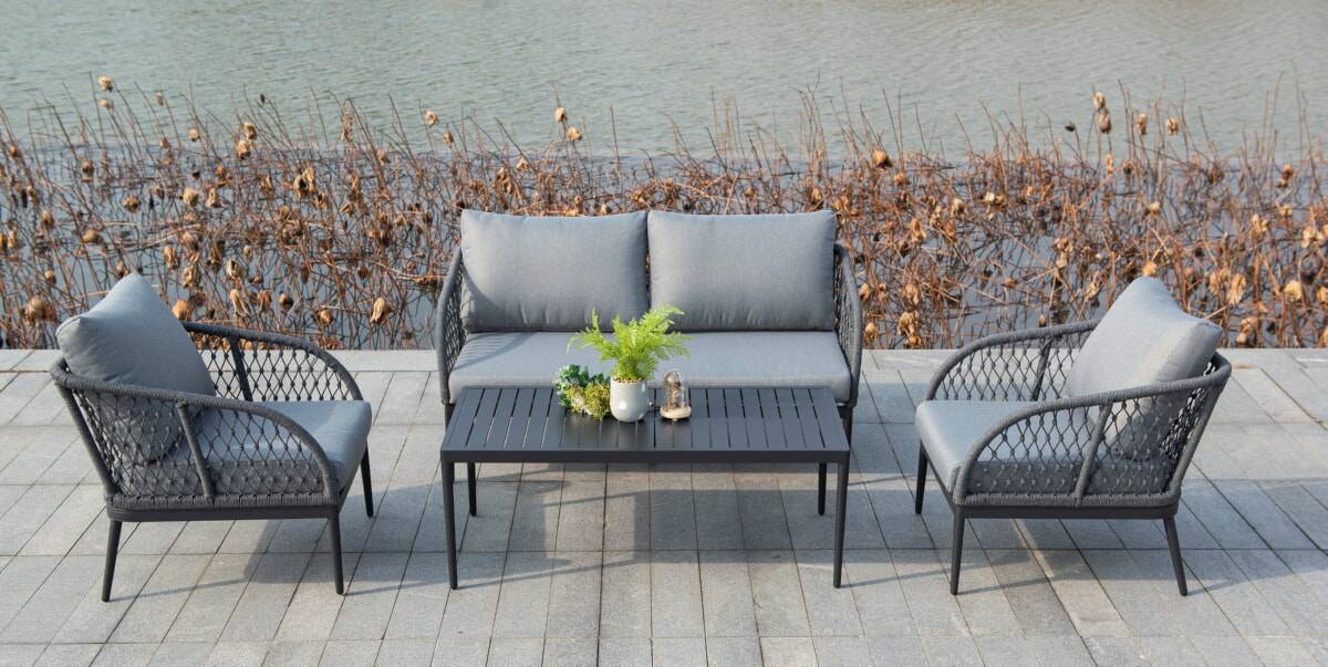 Алюминиевый каркас отвечает за прочность мебели. Он дополнен декоративной ручной оплеткой, которая изготовлена из эластичных синтетических лент. За основу взято высокопрочное полиэфирное волокно. Модель представлена в темно-сером цвете.