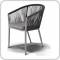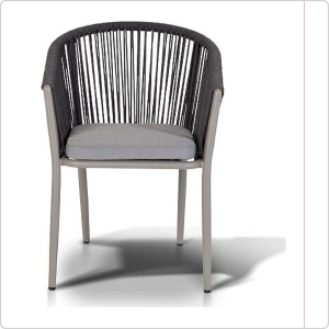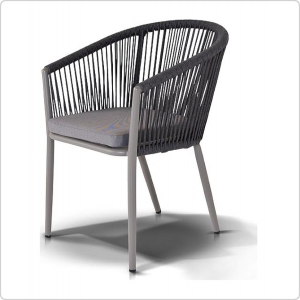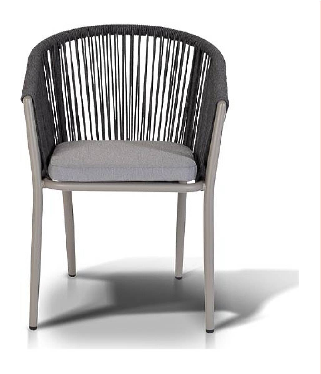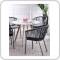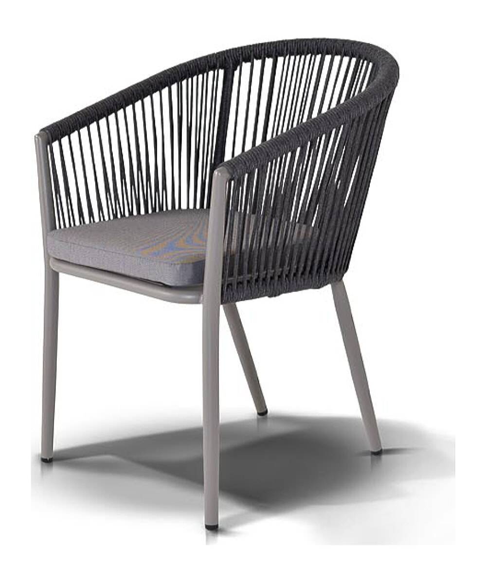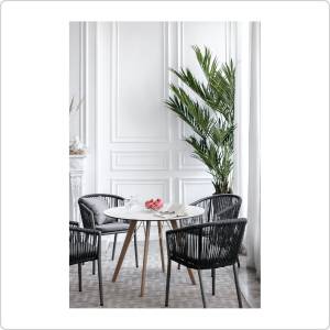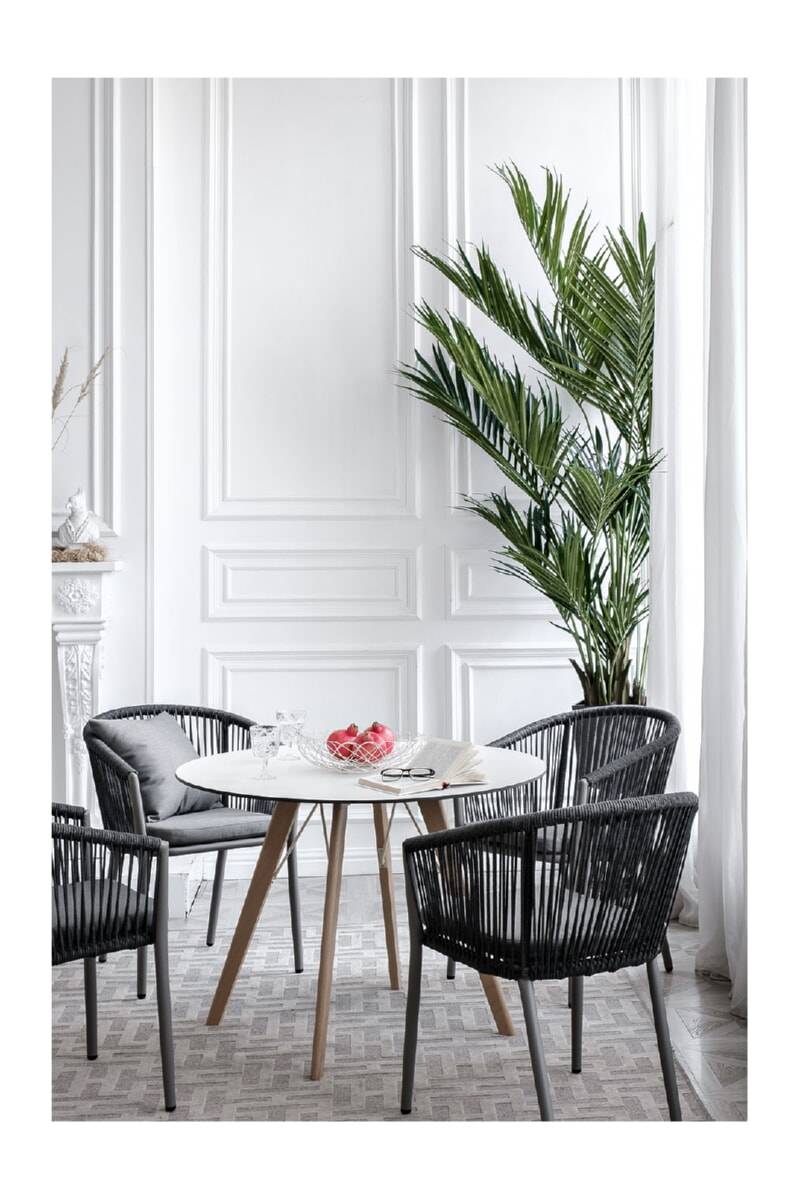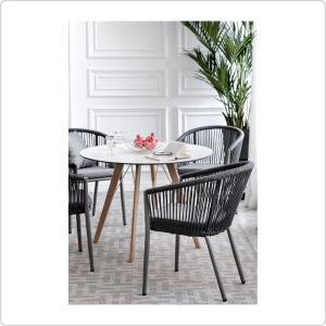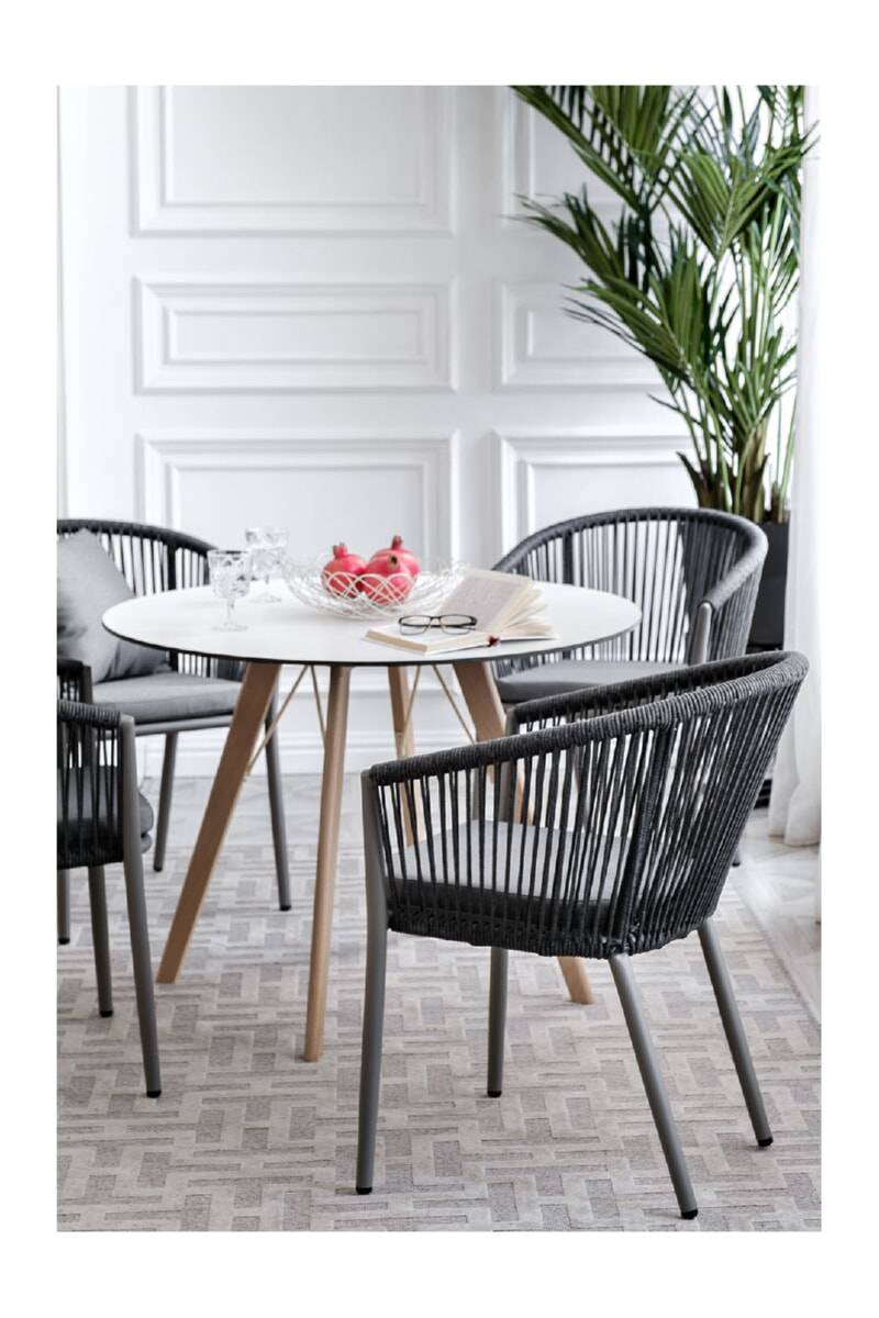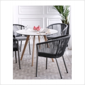 Обеденная группа состит из стола со столешницей HPL молочного цвета, диаметр 90 см (деревянное подстолье) и 4х кресел из алюминиевого каркаса, оплетенного вручную эластичными синтетическими лентами из высокопрочных полиэфирных волокон, в комплекте с подушкой, цвет темно-серый.