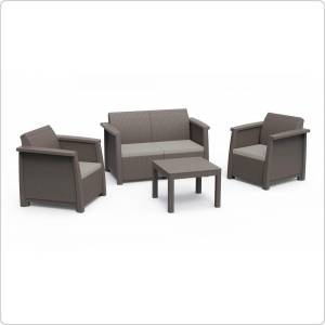 Небольшой двухместный диван с двумя креслами и кофейным столиком составляют отличный комплект уличной мебели, который может быть установлен как на открытой площадке, так и в помещении, либо на балконе.