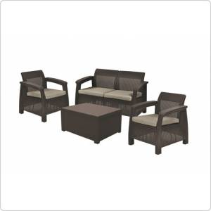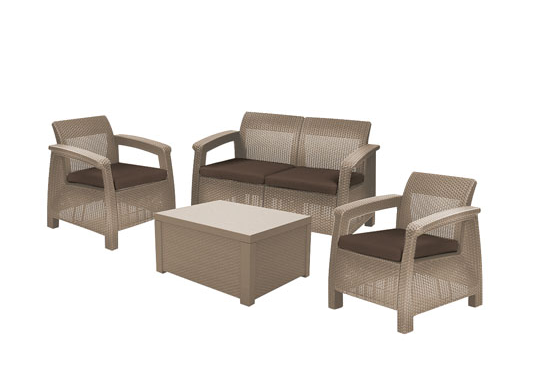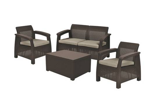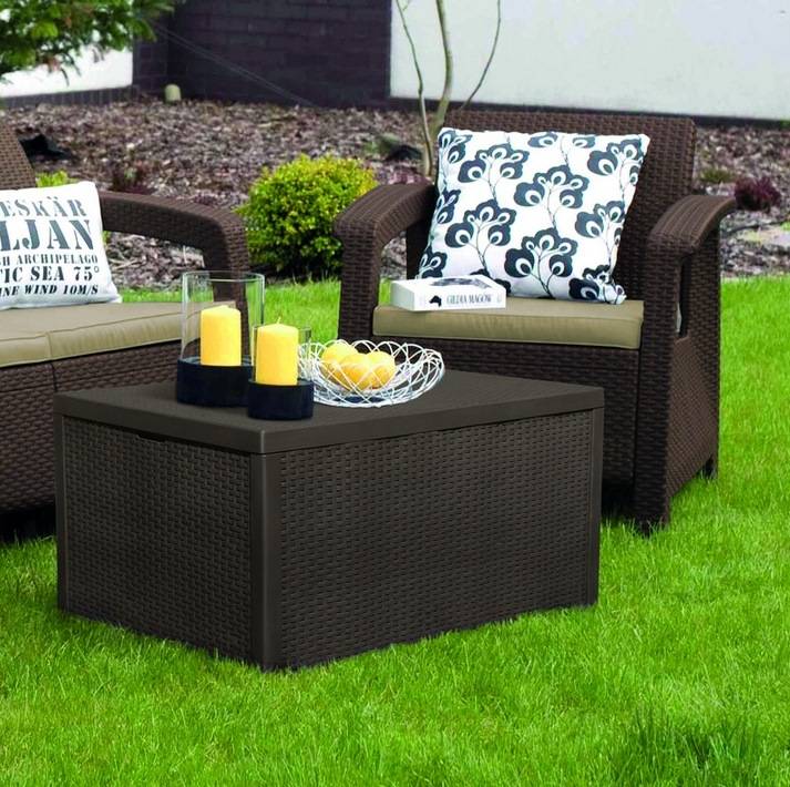 Комплект Keter Corfu box Set очень удачная новинка, которая практически сразу стала хитом. Успех этой модели кроется в новой комплектации. Обычный столик был заменен столом-сундуком, в котором вы можете хранить все, что Вам угодно. Также в комплект входят небольшой двухместный диван и два кресла.