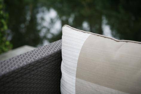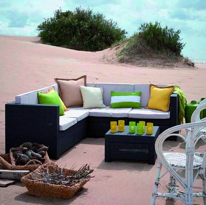 Благодаря стойкому полипропилену, цвета не выгорают на солнце и не бледнеют со временем. Чехлы на подушках выполнены из плотной ткани, так же устойчивой к атмосферным явлениям. Все это позволяет без тркда использовать комплект в условиях открытого воздуха.