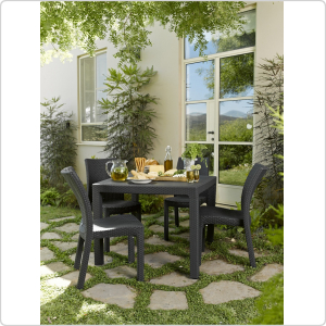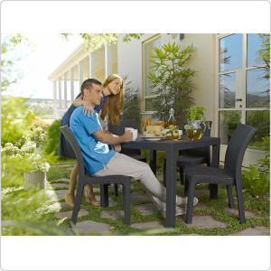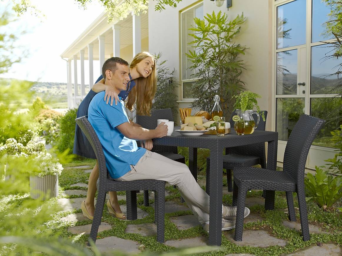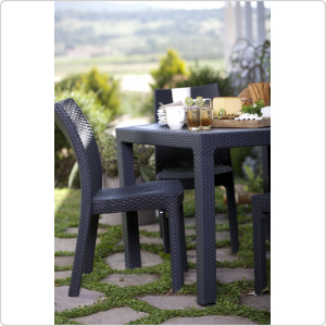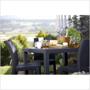 Стол Melody Quartet выполнен из погодостойкого пластика, имитирующего искусственный ротанг. Он не выгорает и не деформируется на солнце и может храниться на улице хоть круглый год. Не ржавеет и не гниет.