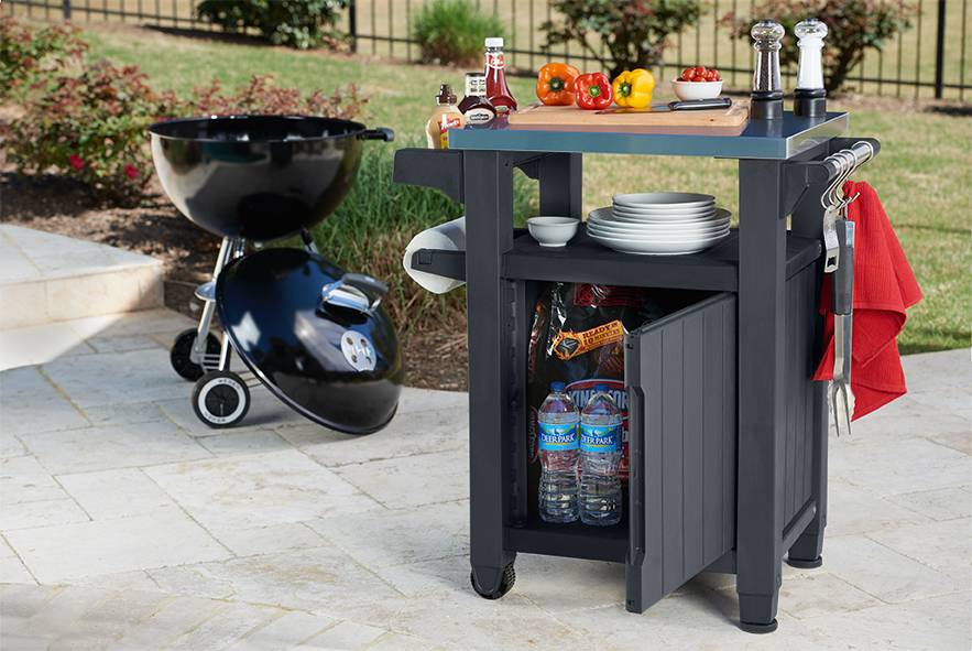 Столик для барбекю Keter UNITY 105 L - новое решение для дачного отдыха. Этот стильный и компактный стол из пластика с металлической столешницей и встроенной тумбой для хранения станет отличным помощником на веранде или уличной площадке. Подходит для использования паре с барбекю грилем или может размещаться отдельно, например, в беседке или летней кухне.