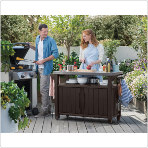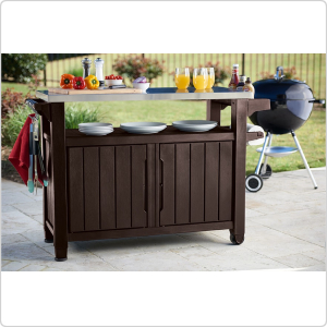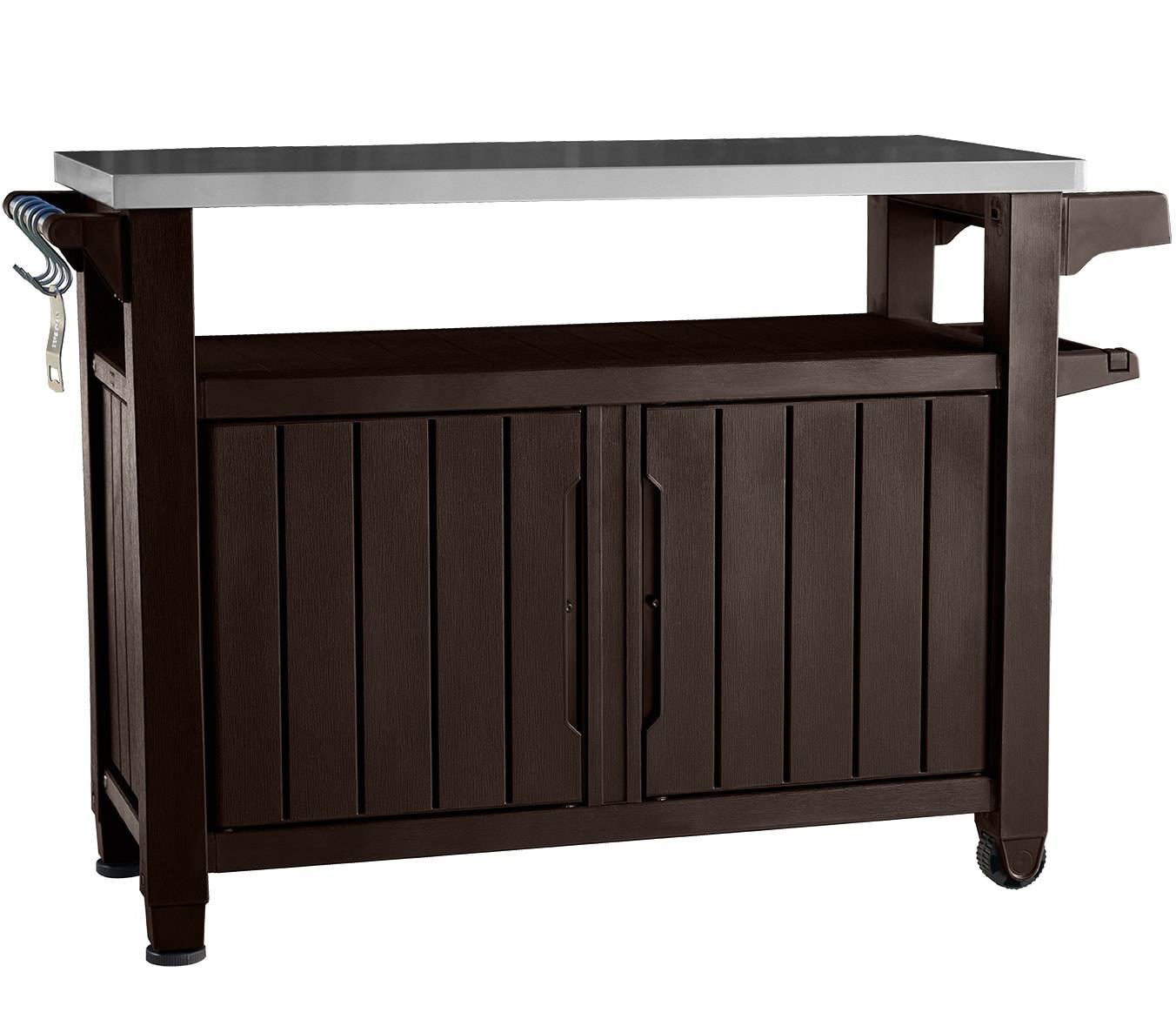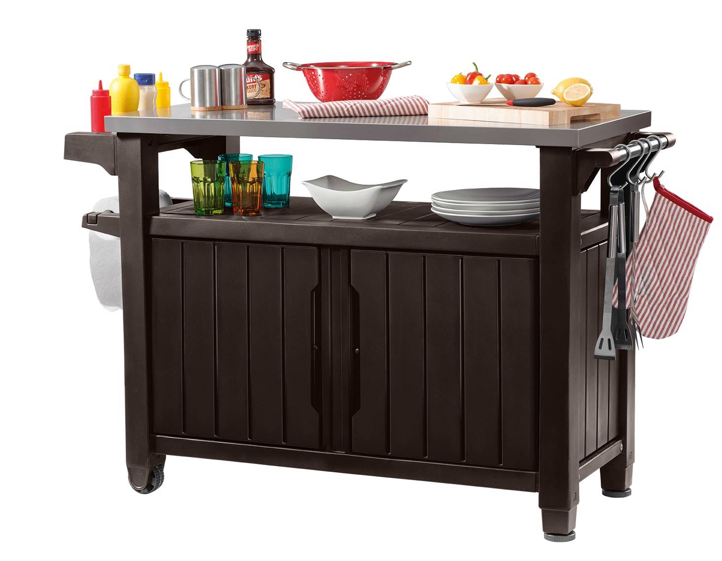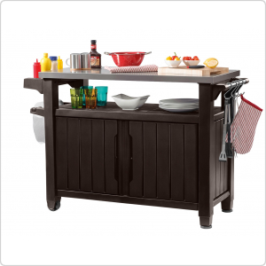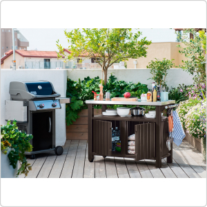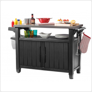 Столик для барбекю Unity XL 207L - стильный и компактный стол из пластика с металлической столешницей и встроенной тумбой для хранения станет отличным помощником на веранде или уличной площадке. Его можно использовать в паре с барбекю грилем или размещать отдельно, например, в беседке или летней кухне.