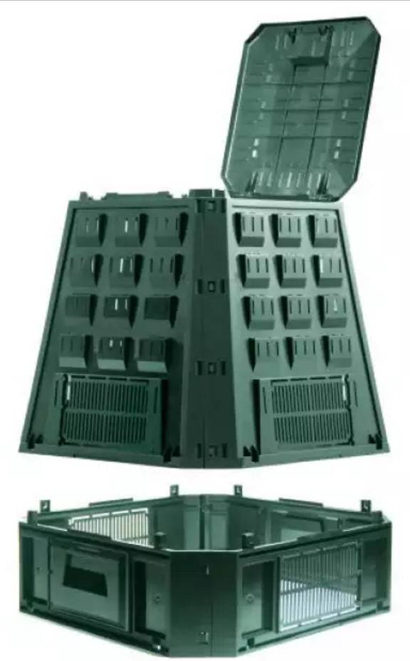 Компостер Prosperplast Evogreen IKEV630Z-G851 представляет собой пластиковый короб в форме усеченной пирамиды с крышкой и закрывающимся боковым отверстием для извлечения компоста. Такая конструкция обеспечивает его устойчивость к повреждениям и плохим погодным условиям. Компостер сделан из пластика с учетом всех требований для производства качественного органического удобрения. Он отлично держит тепло и имеет отверстия для вентиляции, что значительно ускоряет процесс компостирования. Небольшие отверстия облегчают приток воздуха, а закрытая форма делает невозможным доступ животных к хранящихся отходов. Благодаря откидной створки в нижней части компостера, мы имеем доступ к готовому компосту. Материал, из которого изготовлен Evogreen, делает его легким и чрезвычайно прочным.