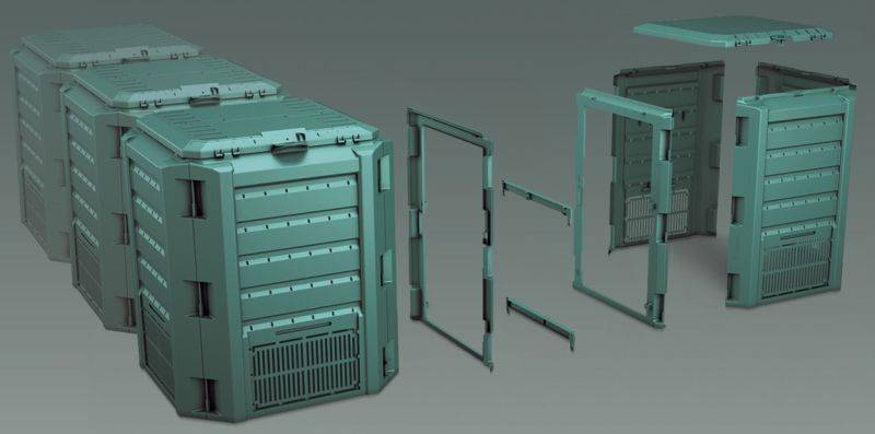 Компостер Prosperplast Module IKSM1200C-S411 состоит из трех пластиковых коробов объединенных между собой с крышкой и закрывающимися боковыми отверстиями для извлечения компоста. Сделан из пластика с учетом всех требований для производства качественного органического удобрения. Компостер отлично держит тепло и имеет отверстия для вентиляции, что значительно ускоряет процесс компостирования. Небольшие отверстия облегчают приток воздуха, а закрытая форма делает невозможным доступ животных к хранящихся отходов. Благодаря откидным створкам в нижней части компостера, мы имеем доступ к готовому компосту. Материал, из которого изготовлен Prosperplast Module, делает его легким и чрезвычайно прочным.
