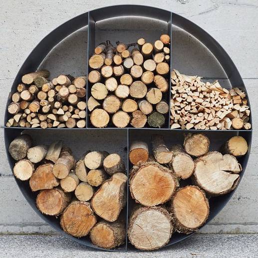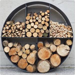 Стильная уличная дровница диаметром 100 см из 3 мм стали. Дровница имеет пять секций, в которых удобно хранить как розжиг, так и дрова. Ширина уличной дровницы 35 см, она идеально подойдет как для каминных дров, так и для садовых очагов. Дровница имеет крепление, так что ее можно свободно зафиксировать к стене или к полу.