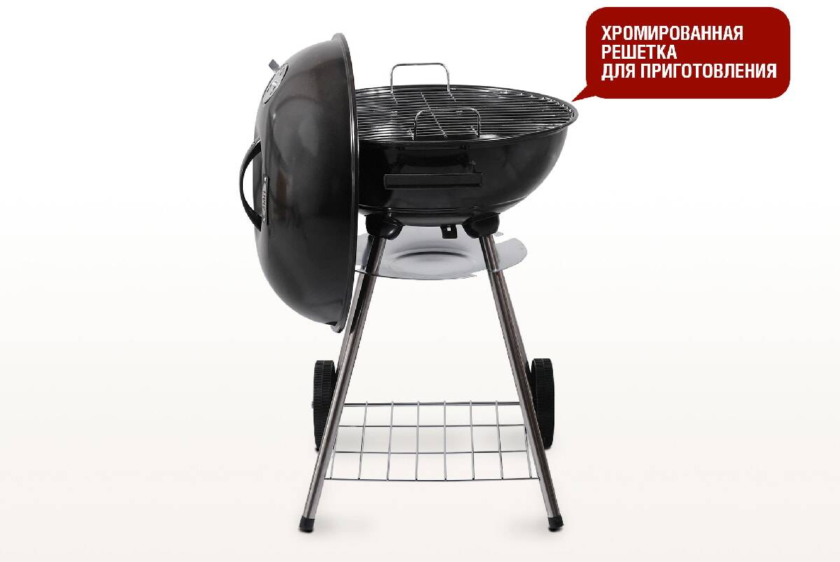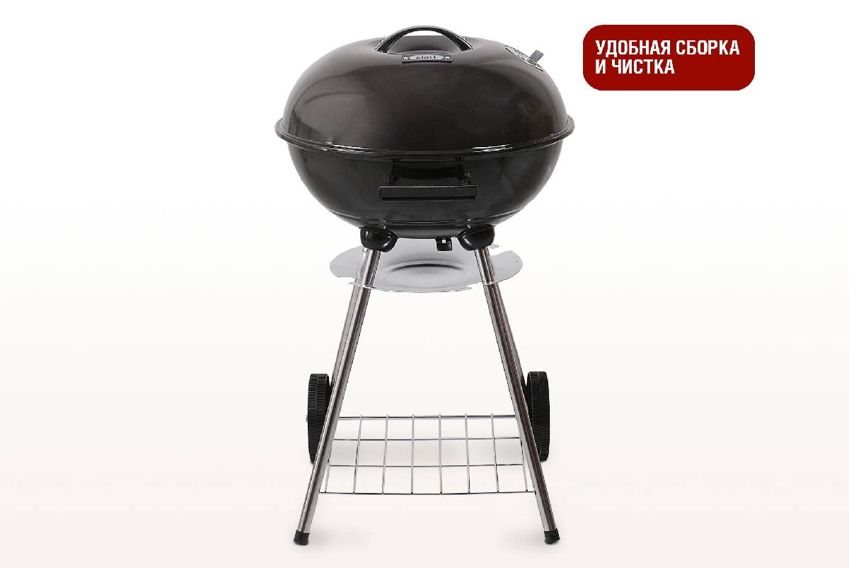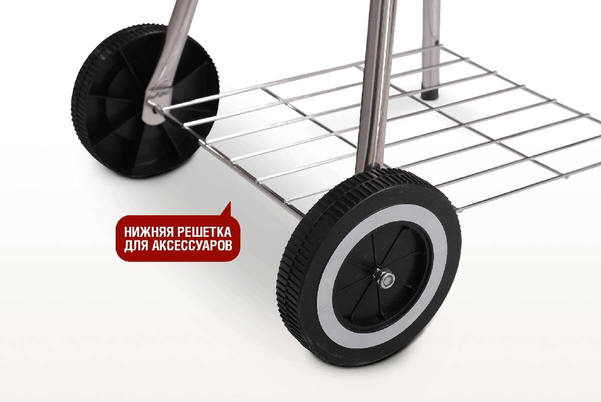 Модель обладает компактным размером, легкостью, а благодаря наличию колес гриль можно БЕЗ ТРУДА перемещать.