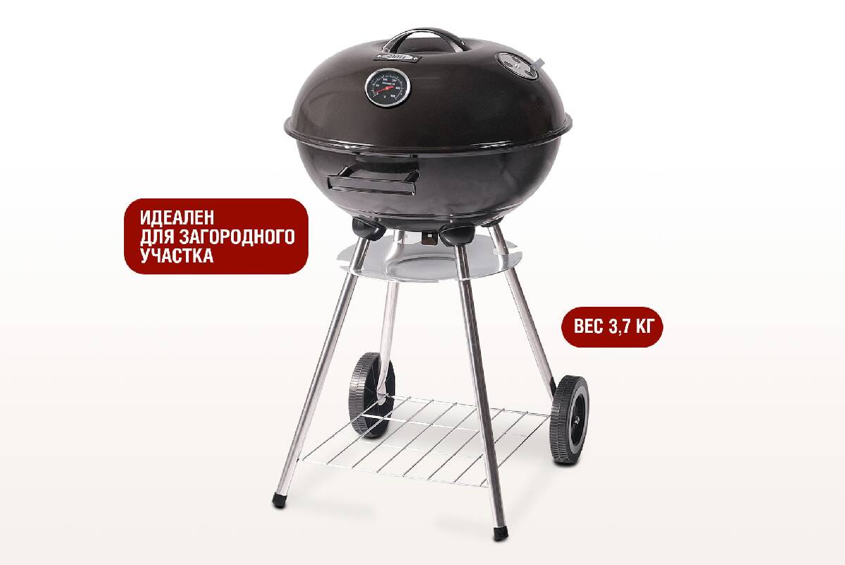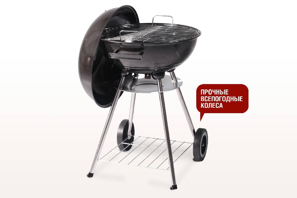 Модель обладает компактным размером, легкостью, а благодаря наличию колес гриль можно БЕЗ ТРУДА перемещать.