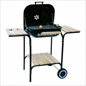 Гриль - Коптильня имеет четыре устойчивые ножки, две из которых снабжены колесиками. Благодаря этому гриль легко можно передвигать с места на место. Гриль снабжен сразу 3 полками: 2-мя деревянными и 1-й нижней. На них можно с удобством располагать продукты, посуду, щипцы и т.д.