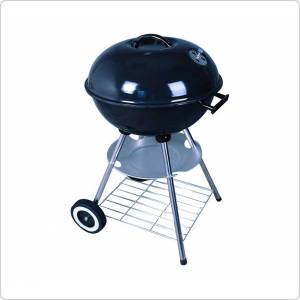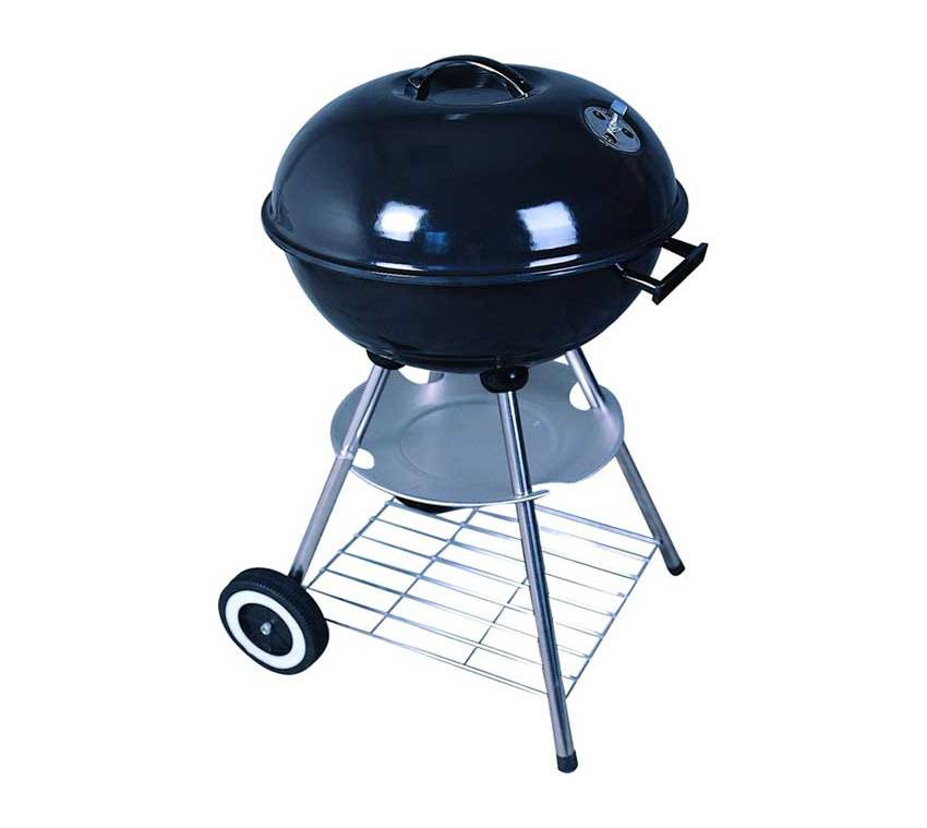 Гриль-коптильня имеет четыре устойчивые ножки, две их которых снабжены колесиками. Снизу располагается две нижние полочки. На гриле установлены два регулятора подачи воздуха. Высота гриля 75 см, диаметр 44 см.