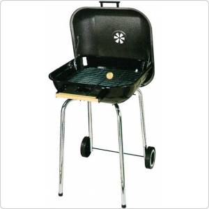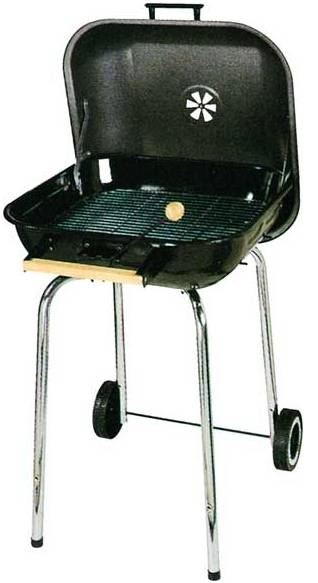 Гриль-коптильня имеет четыре устойчивые ножки, две их которых снабжены колесиками. На гриле установлен регулятор подачи воздуха. Высота гриля 99 см, размер 41 на 41 см.