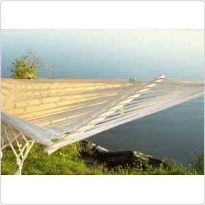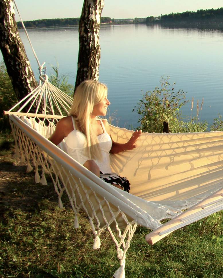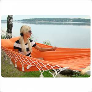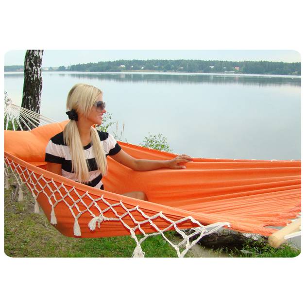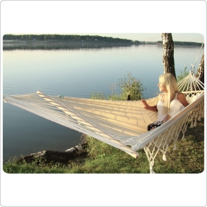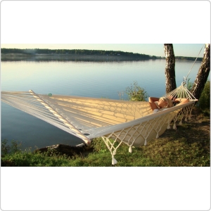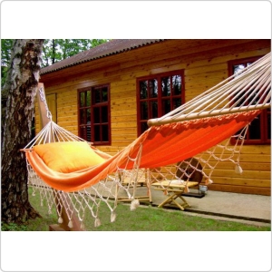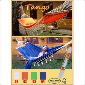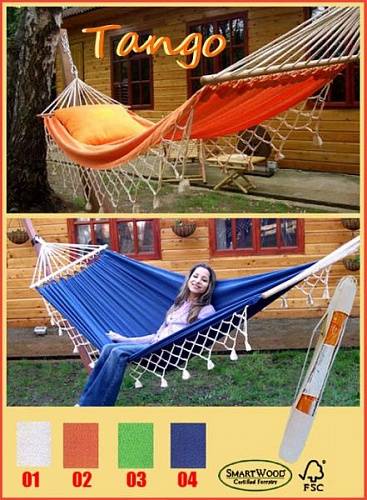 Гамак «Tango» идеально подойдет для «цивилизованного» отдыха и может быть размещен на даче, в саду, в лоджии и дома. Изготовленный вручную из высококачественного хлопка гамак украшен изящной бахромой, так же ручного плетения. Гамаки задолго до Колумба изобрели американские индейцы. Сначала они изготавливались без реек – исключительно для того, чтобы спать. Лишь с прибытием в Америку белых людей, с развитием особой «усадебной» культуры фазенд, плантаторы стали перенимать традиции местного населения. Гамаки заменяют скамьи во время приемов, их украшают изысканной бахромой и узорами, господа спорят – чей гамак лучше. На такого рода «сидячих» гамаках появляются поперечные перекладины. Гамак «Tango» использует для реек чрезвычайно плотную и красивую древесину массарандубы, бразильской вишни.