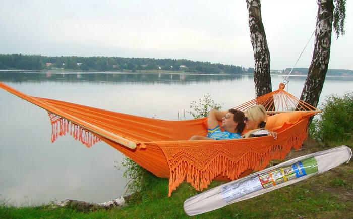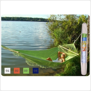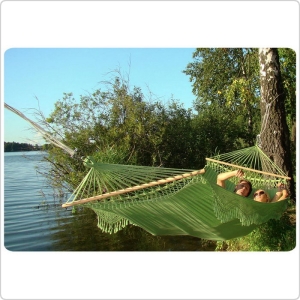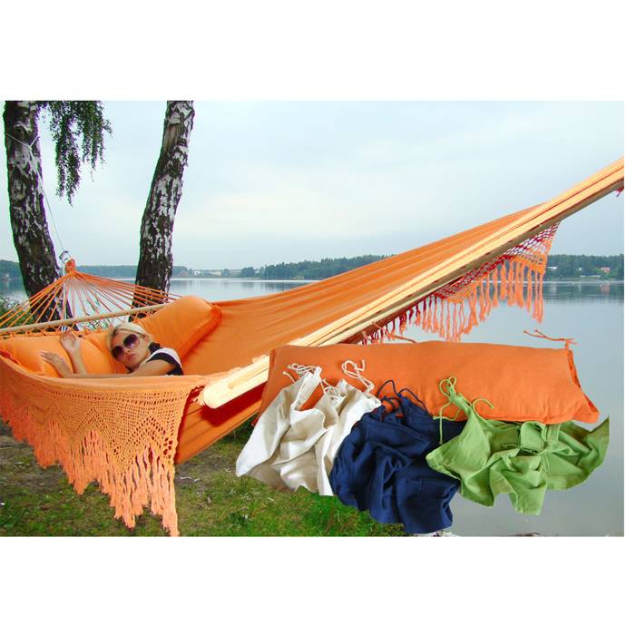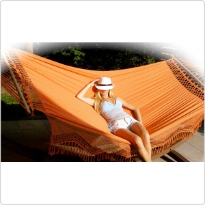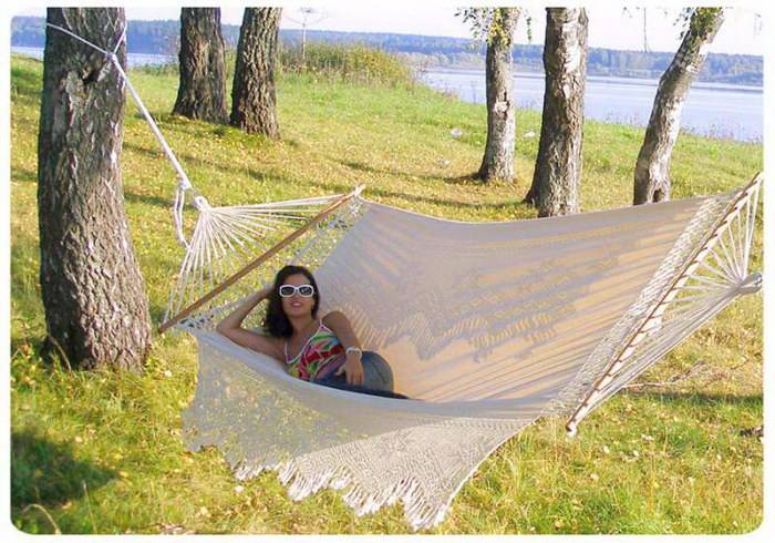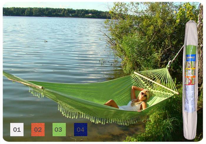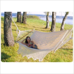 Гамак изготовлен вручную из 100% хлопка, удивительная текстура которого такова, что способна и пропускать воздух, и идеально повторять контуры тела. Поэтому в таком гамаке всегда можно принять удобное положение – сладко потянуться или же поработать сидя с ноутбуком.