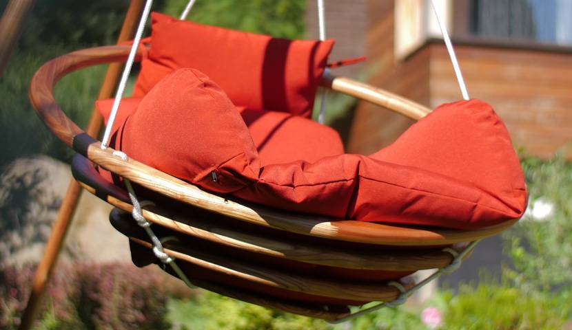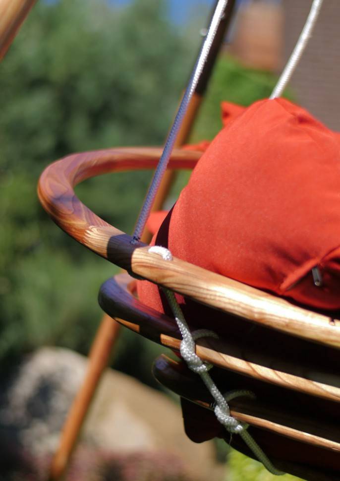 Подвесное кресла с деревянным каркасом в виде полусферы и подушками
