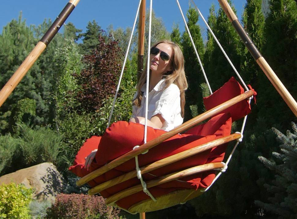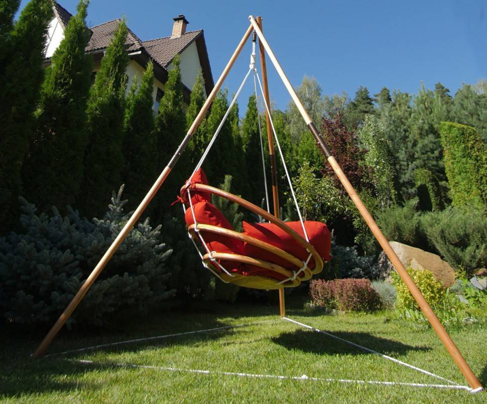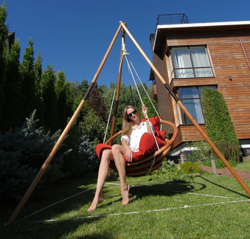 Оригинальная модель кресла качели с подушками МАЙЯ надежно крепится на изящную в виде пирамиды стойку деревянный каркас МАЙЯ. Она выдерживает значительный вес - до 150 кг.