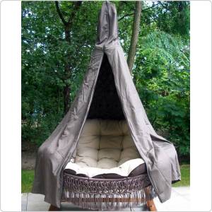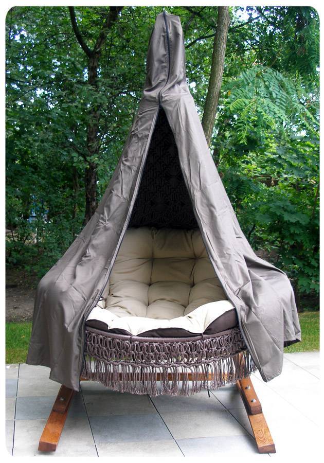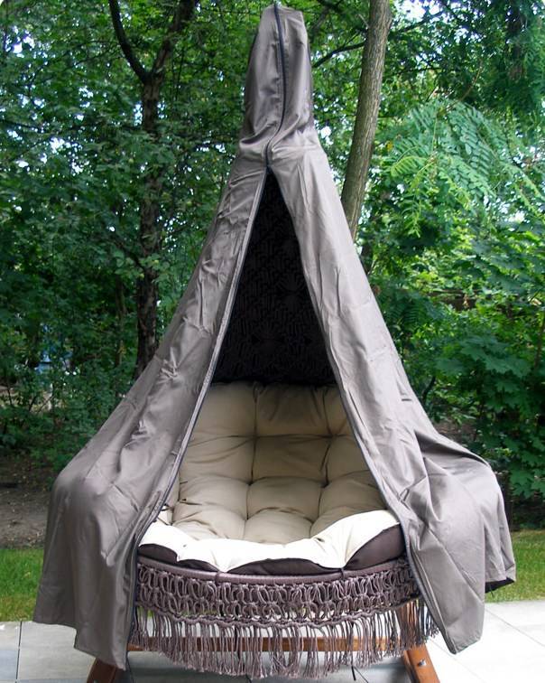 В удобном кресле-гамаке невероятно приятно отдыхать. В отличие от гамака он занимает минимум свободного места на драгоценной земле дачного участка. В нем так удобно расположиться, почитать любимый журнал или просто расслабиться. В общем кресло гамак вещь прекрасная, но есть одно но… Если Ваше кресло-гамак располагается на улице, то оно конечно же подвержено воздействию непогоды. Будет очень неприятно, если Ваше любимое подвесное кресло с мягкими подушками вымокнет ночью под дождем. Может ничего страшного и не произойдет, но долгая сушка кресла, вместо отдыха Вам обеспечена.