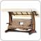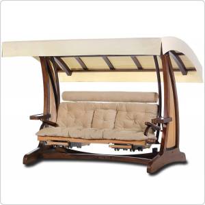 В спинке подвесной скамьи имеется встроенный мини-бар, оснащенный крышкой-столиком. Подлокотники украшены декоративными искусственными камнями. Эта изысканная модель для комфорта оборудованы специальными выдвижными подставками для ног. Для дополнительного комфорта качели оснащены навесом, изготовленным из современной ткани с водоотталкивающим покрытием. Цвет тента можно выбирать (бежевый, серый, зеленый).