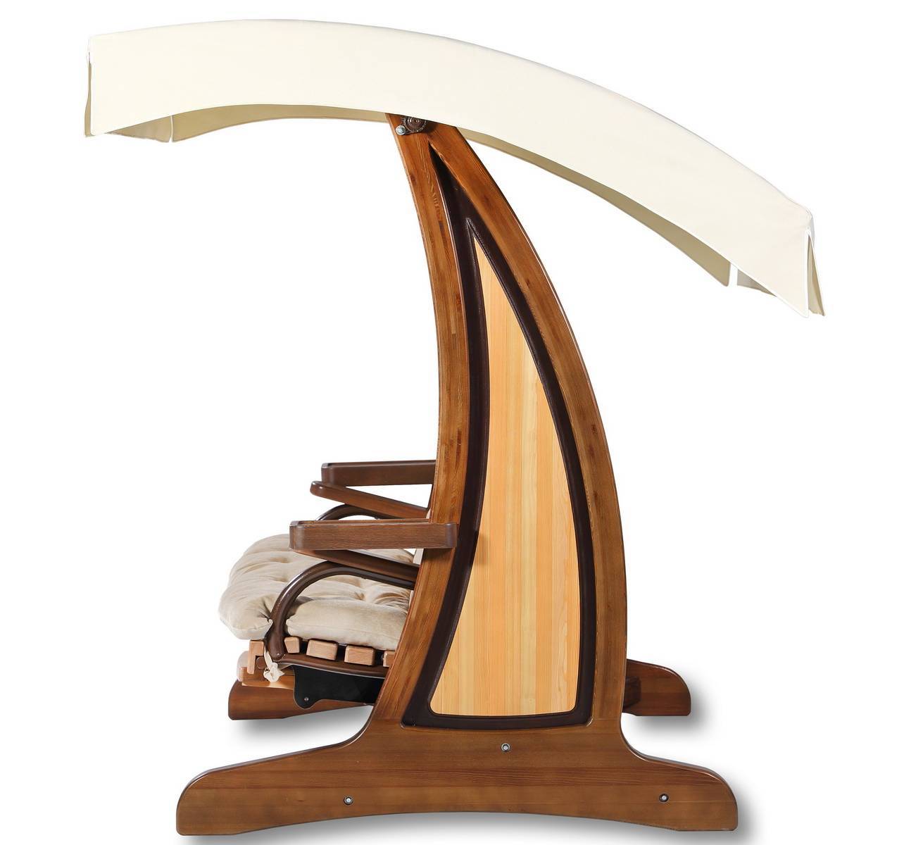 Деревянная подвесная скамья с удобным сплошным подголовником и регулируемой спинкой подвешена на каркасе при помощи металлических элементов. Навес изготовлен из высокопрочной ткани европейского производства с водоотталкивающим покрытием, прекрасно защитит Вас во время отдыха от палящего солнца, либо в ненастную погоду от дождя.
