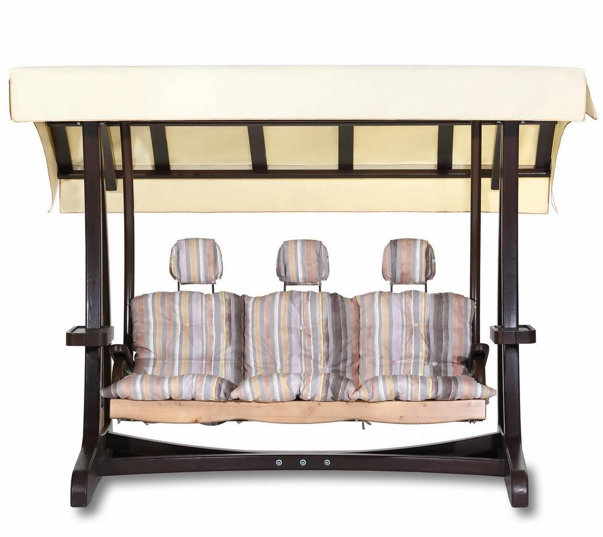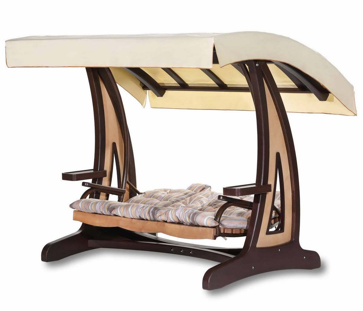 В садовых качелях Леда Валенсия 1 применяется каркас из натуральной древесины. Деревянная подвесная скамья с удобными подголовниками и регулируемой спинкой подвешена на каркасе при помощи металлических элементов. Навес изготовлен из высокопрочной ткани европейского производства с водоотталкивающим покрытием, прекрасно защитит Вас во время отдыха от палящего солнца, либо в ненастную погоду от дождя.