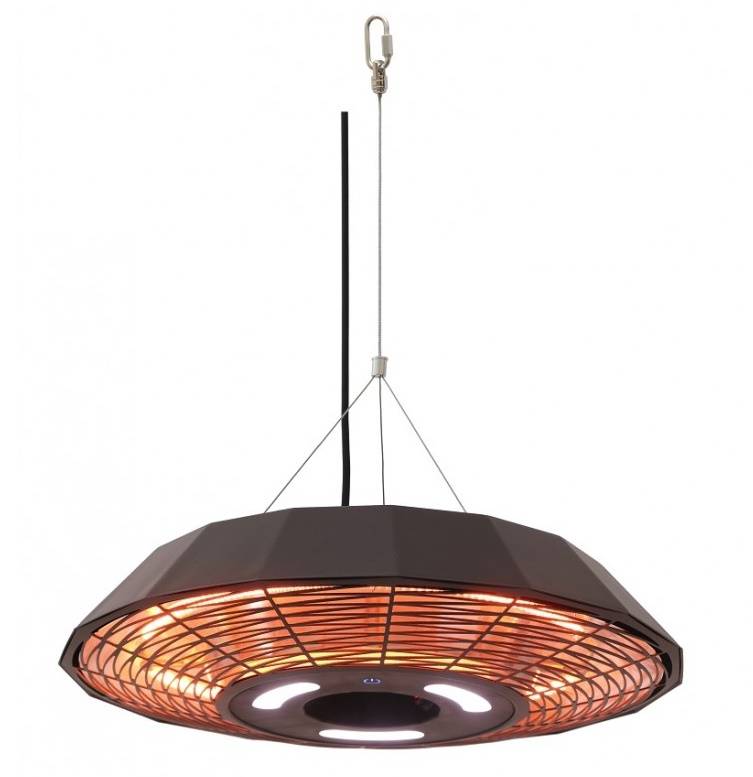 Подвесной обогреватель оснащен системой защиты стандарта IP24 от пыли и влаги. Ему не страшны ни сырость, ни ветер, несущий частички мусора. Нагревательный элемент закрыт частой металлической решеткой, которая не является препятствием для распространения тепла и мягкого свечения от светодиодов, но гарантировано защищает кожу рук от ожогов при случайном прикосновении к инфракрасной колбе. Срок службы галогеновой лампы составляет 5000 часов.