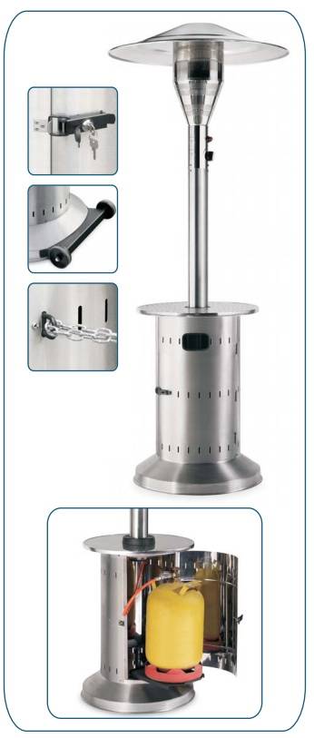 Газовый обогреватель Enders COMMERCIAL выполнен из высококачественной сатинированной стали не чувствительной к погодным условиям. Подставка очень практична, на нее можно поставить бокал или что-то еще. Мощность в 14 кВт создает приятное тепло, которое вы, безусловно, оцените в по-настоящему прохладные дни. Извлекаемая полка для газового баллона делает возможной удобную смену баллона, а опускаемая стойка – обеспечивает компактное хранение.