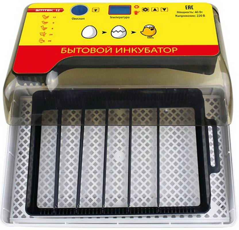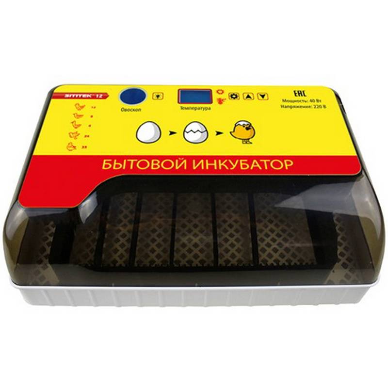 SITITEK 12 — недорогой инкубатор с универсальным лотком, рассчитанный на выведение 12 куриных, 9 утиных, 4 гусиных, 24 голубиных или 35 перепелиных яиц. Самостоятельно поддерживает заданную пользователем температуру внутри инкубационной камеры и осуществляет автоматический поворот яиц. Предусмотрена тревожная сигнализация при отклонениях температуры. Имеется встроенный светодиодный овоскоп для проверки качества яиц и развития эмбриона. Питается устройство от сети 220 В.