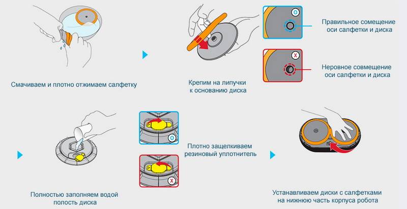 Подготовка полотера занимает всего одну минуту. Необходимо смочить и отжать салфетки из микрофибры, набрать резервуары для воды и установить их на дно робота. Резервуары для воды выполнены в виде пластиковых дисков. В них имеются отверстия для равномерного смачивания салфеток в течение цикла уборки. Модель RS700 способна проработать до 100 минут. Резервуары для воды рассчитаны на 50 минут работы полотера, поэтому после окончания первой половины цикла уборки через 50 минут робот сообщит о необходимости наполнить резервуары снова. После двух-трех циклов уборки рекомендуется стирать салфетки в стиральной машинке